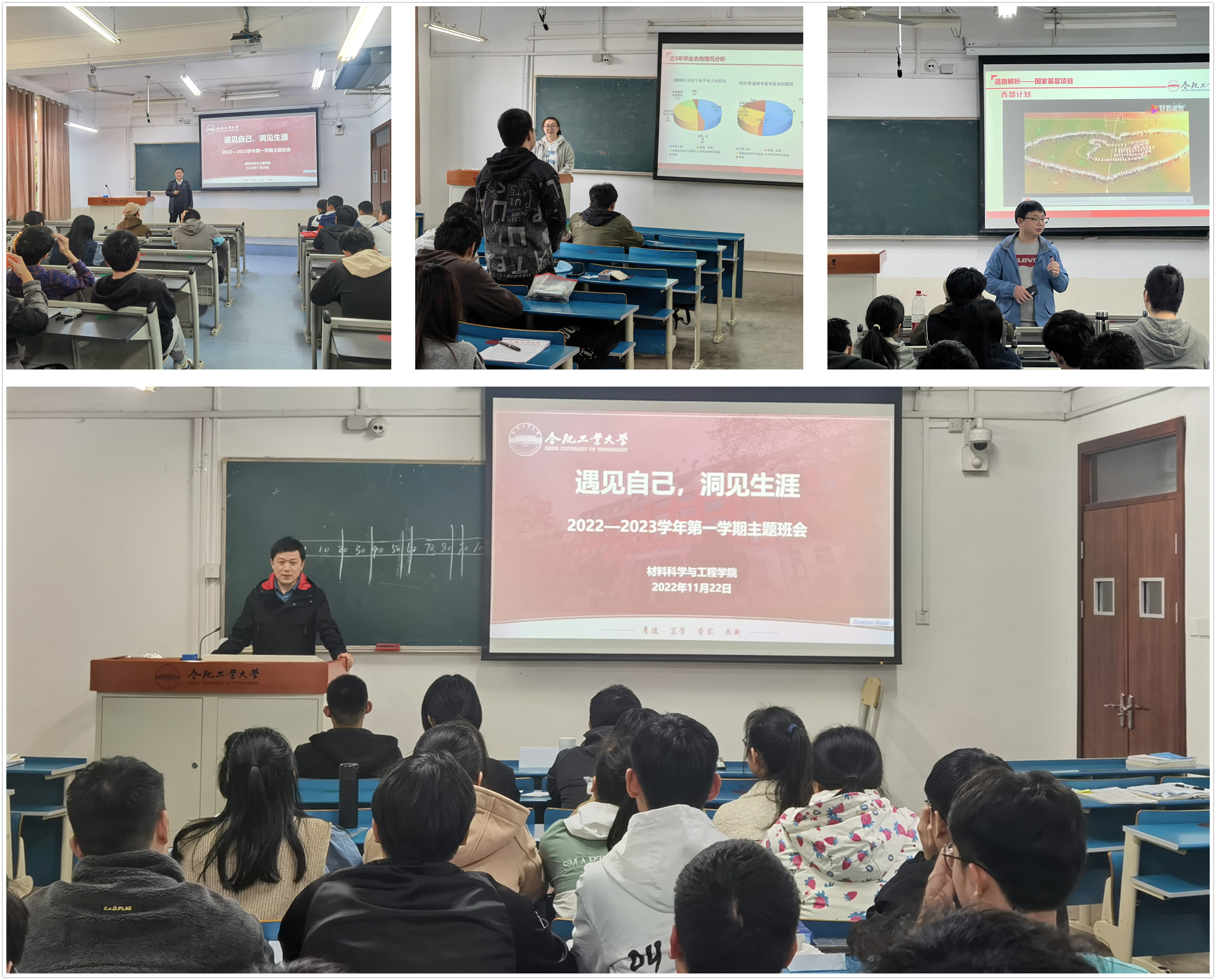 11月22日至26日,开云官方官网登录入口在屯溪路校区主教学楼组织开展了“遇见自己,洞见生涯”职业生涯规划教育主题班会。学院2020级辅导员、各班级班主任和全体同学参与本次主题班会。