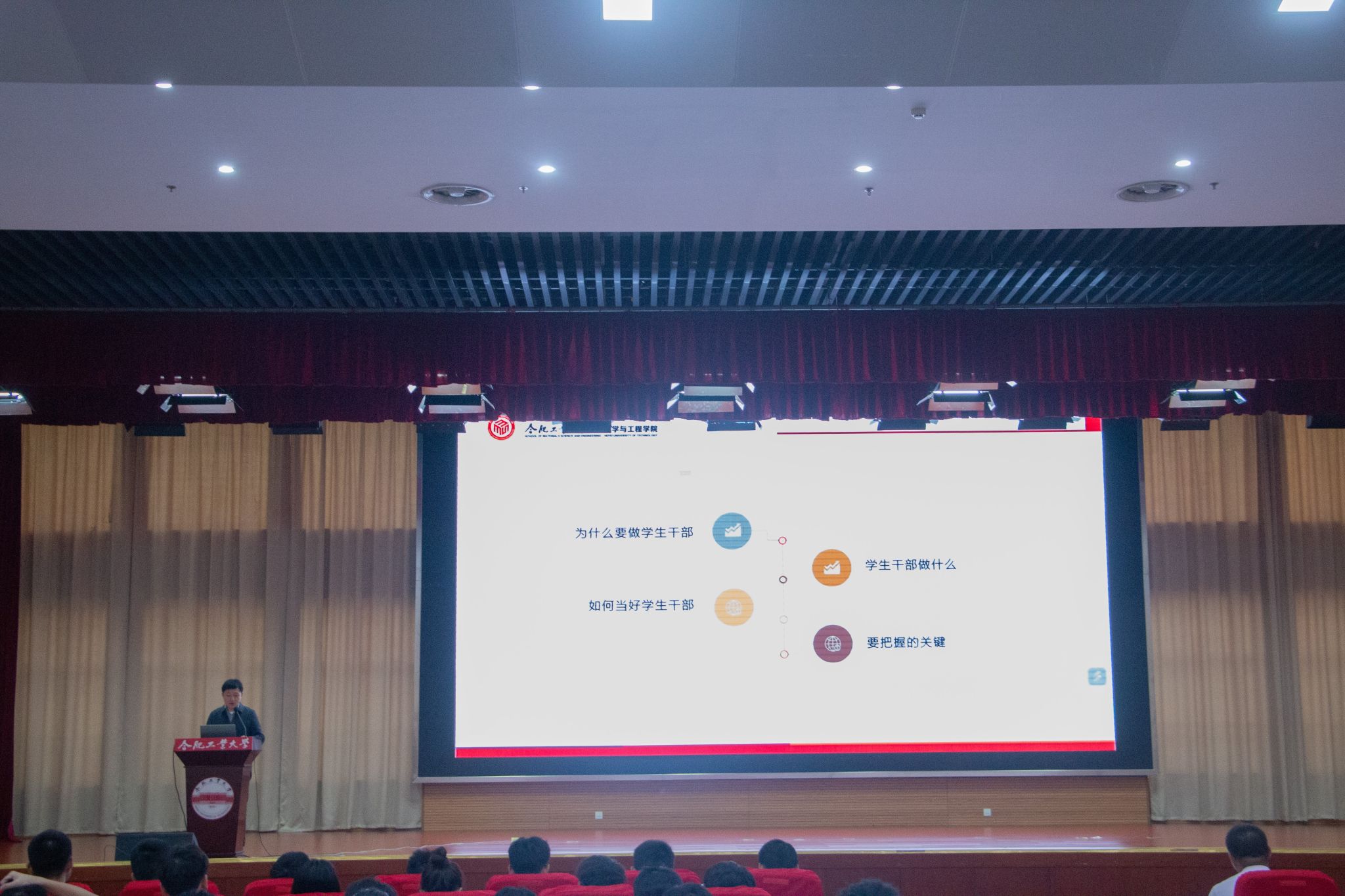 典礼结束后,学院党委副书记兼纪委书记朱峰为全体学员作了主题为“如何做一名优秀学生干部?”的专题培训报告。朱峰老师围绕习近平新时代中国特色社会主义思想和党的二十大报告有关精神,结合青年学生特点,从为什么要做学生干部、学生干部做什么、如何当好学生干部等方面对学生骨干提出了要求与标准、期许与展望,他表示学生骨干要时刻牢记学生这一首要身份,担起学生工作职责,成为敢为人先、敢为吃苦、敢为奉献的新时代好青年。