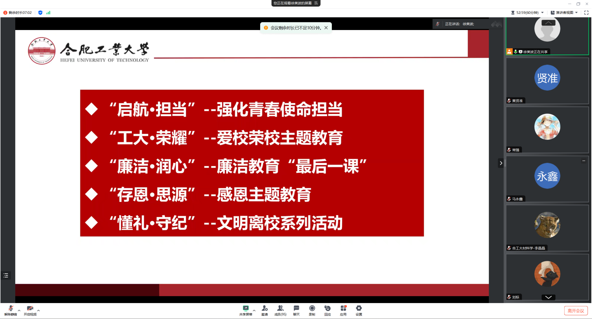 辅导员徐美波重点围绕学校文明离校的有关工作布署,就理想信念教育、爱校荣校教育、廉洁自律教育、感恩诚信等内容为毕业生上了“最后一堂思政课”,提醒同学们要安全、文明离校,注意人身、财产、交通安全,谨防网络诈骗,做到文明、安全有序离校的安排,确保顺利毕业。同时就“毕业离校日程安排”、“档案寄发注意事项”、“组织关系转接解读”、“文明离校注意事项”等工作安排进行细致的解释说明,强调了各项材料的注意事项及时间节点,提醒同学们要对一系列毕业手续高度重视并及时跟进,保障毕业各项工作的有序推进。