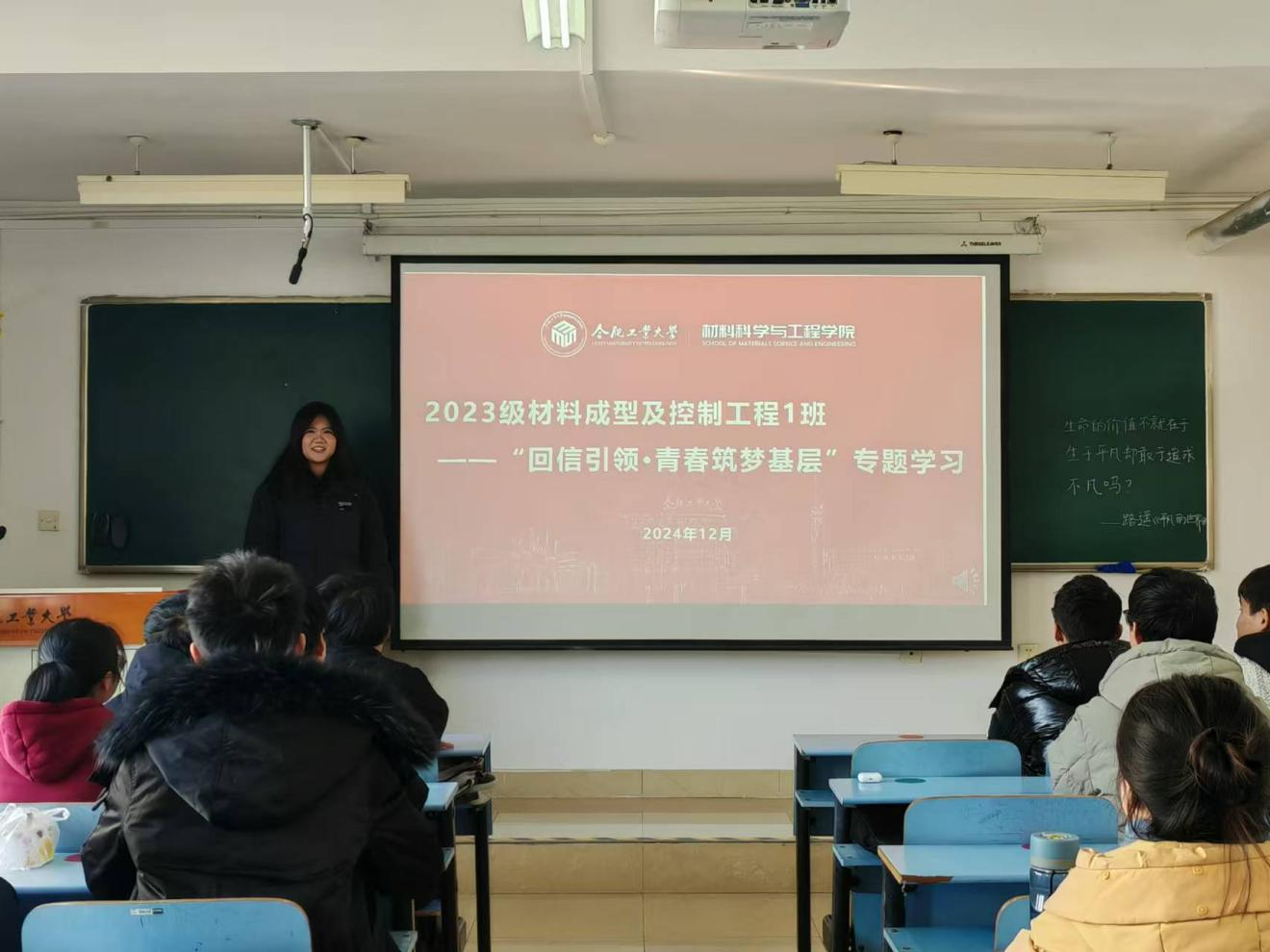 12月24日上午,材料学院组织材料成型及控制工程2023级1班团支部开展了主题为“回信领航·青春筑梦基层”的特色团支部活动。支部青年全部参与了本次团日活动。
