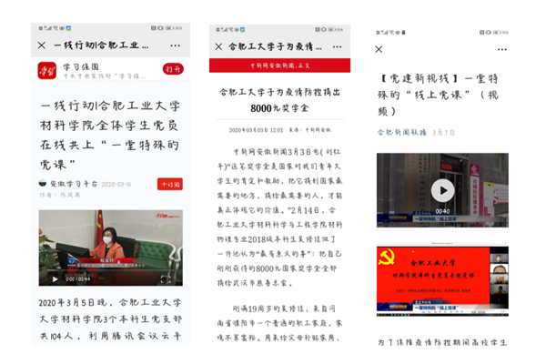 在疫情持续的三个月里,材料学院积极协调各方力量,努力克服各种困难,不折不扣完成上级党委的各项部署和要求,用扎实的工作不断践行职业初心和使命。疫情期间,学院通过各种渠道为抗疫自愿捐款的同学达到606人,捐款共计约44470元。学生中不断涌现出感人的事迹,像18级捐出全额国家奖学金的吴修佳、从海外不远万里为学院捐赠口罩的孟令孜、在家乡主动担任抗疫志愿近160个小时的金邺城等等,他们的事迹先后获得中新网和合工大官网的报道。