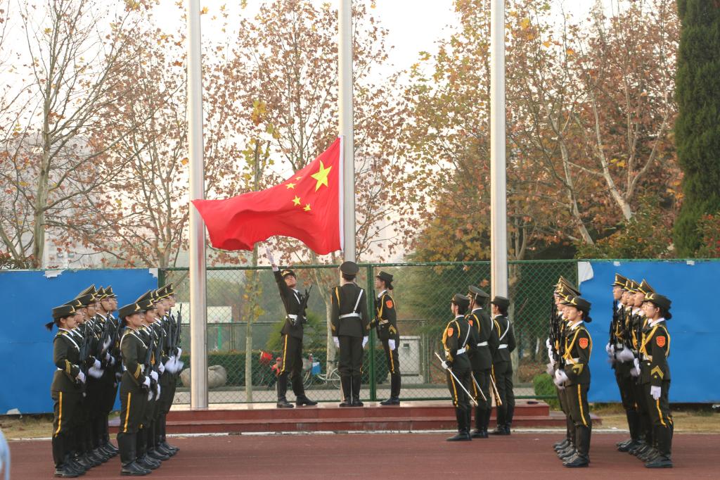7时15分的风雨操场,熠熠暖阳朝气勃发,国旗护卫队高擎着五星红旗走向升旗台,全体师生庄严肃立,伴随着嘹亮的国歌声,注视着五星红旗冉冉升起。