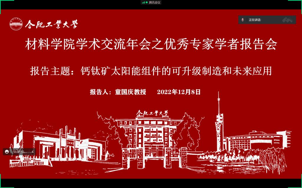 为了提高研究生学术素养,开拓学术视野,提高学生的学习兴趣,材料学院邀请了合肥工业大学黄山学者优秀青年人才计划主持人童国庆教授于12月8日在材料楼6楼601会议室做关于钙钛矿太阳能组件的可升级制造和未来应用报告会。