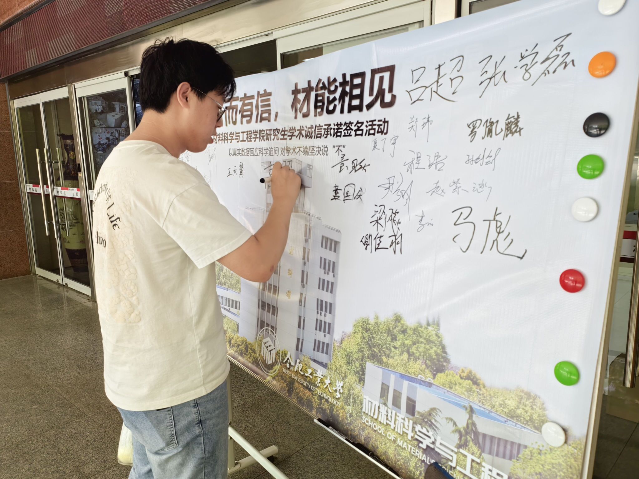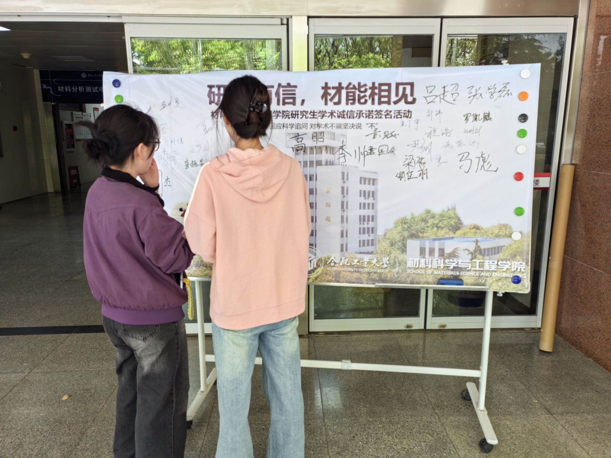 为弘扬科学精神、强化学术诚信意识,营造风清气正的科研环境,材料学院于4月25日上午,在材料楼举办“研而有信,材能相见”学术诚信主题教育活动,活动通过宣誓签名、案例警示、互动问答等形式,吸引了80余名研究生参与。