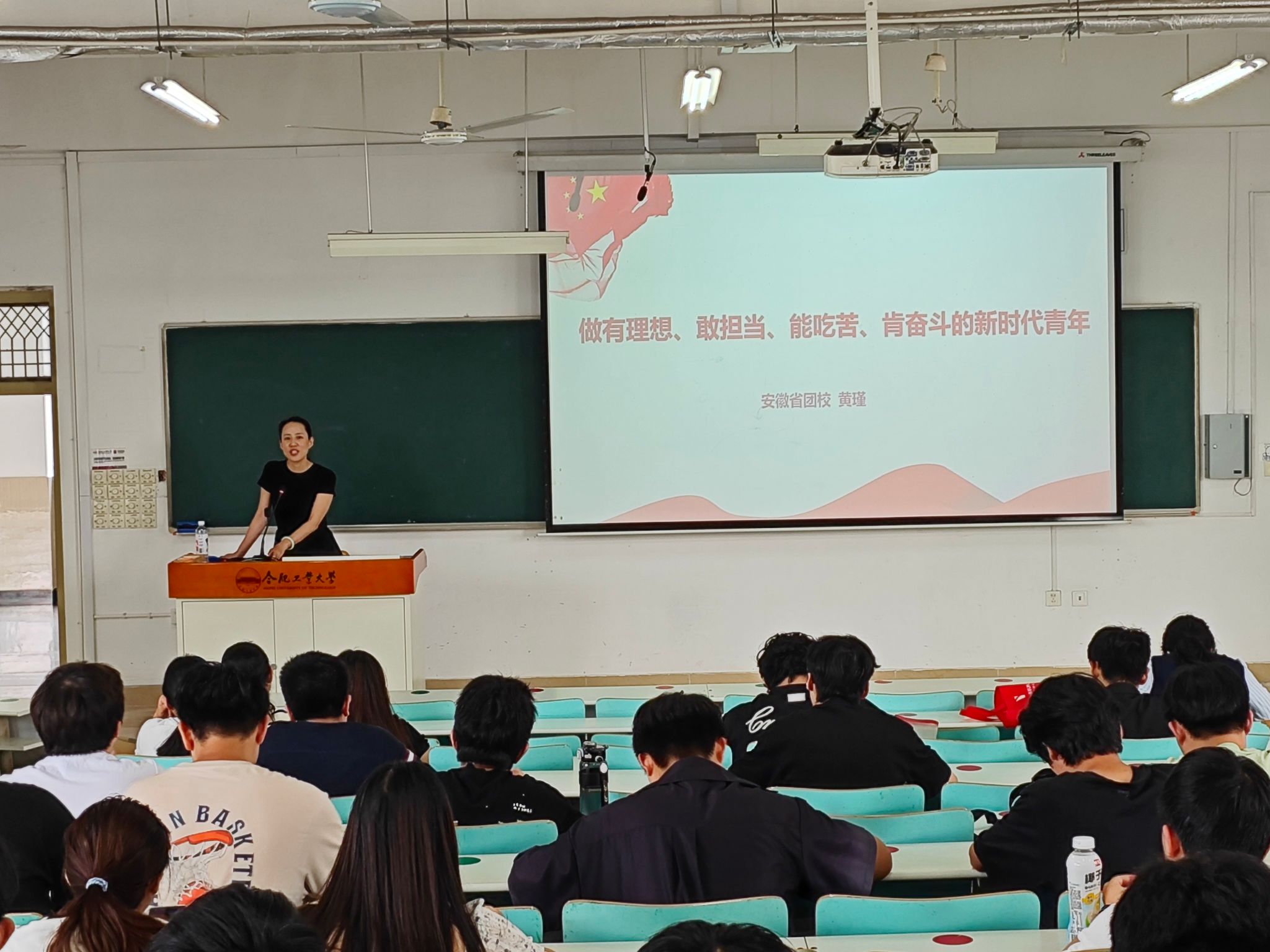 团课第三讲,安徽省团校副教授、《安徽团讯》副主编黄瑾老师围绕“做有理想、敢担当、能吃苦、肯奋斗的新时代青年”这一主题,深入剖析理想信念的重要性,结合当下社会现象,引导学生树立正确的价值观。她同时还分享了许多青年榜样的故事,激励同学们在新时代坚定信念、拼搏奋进,现场学习氛围浓厚。