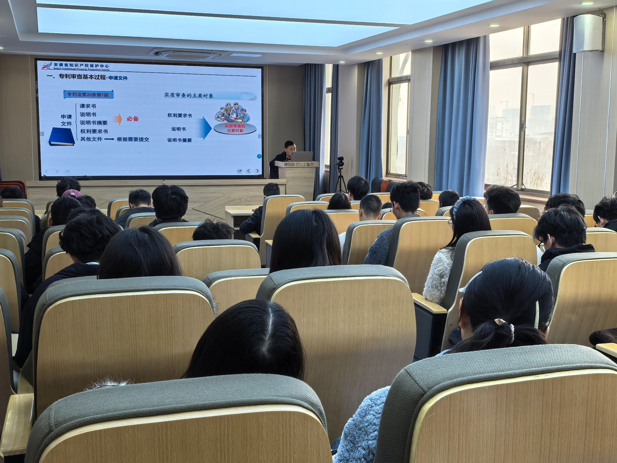讲座现场,特邀安徽省知识产权保护中心专利预审员毕挺聚焦“专利撰写质量提升(从专利快速预审的角度)”主题开展专题讲座,结合材料学科专利申报典型案例与实务经验,系统讲解专利快速预审流程规范、核心审核要点、申请文件撰写常见误区、权利要求书规范表述等关键内容,通过案例剖析、要点拆解的形式,把专业知产知识转化为贴合研究生科研实际的实操技巧,针对性破解专利撰写与预审申报中的难点问题。