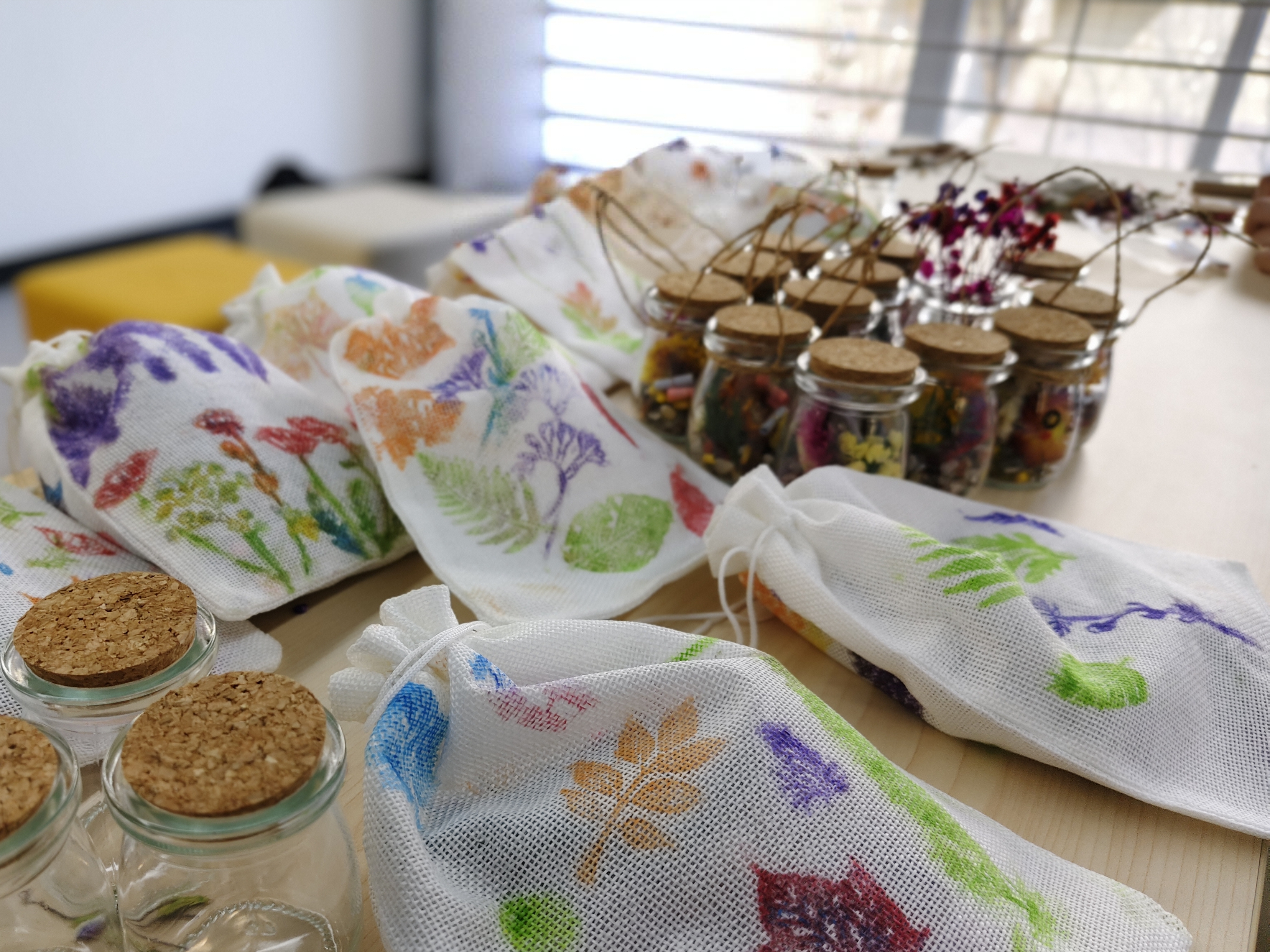 活动伊始,心晴社成员通过PPT宣讲,阐释了活动“以手作疗愈心灵,以温暖传递幸福”的核心内涵,并详细讲解手绘香囊、干花幸福瓶的创作流程与技巧。活动现场分为两大创作区域,手绘香囊区里,同学们以素白香囊为画布,借助植物拓印模板与多彩颜料,将烂漫春日意象定格于布面;干花幸福瓶区中,大家精心挑选满天星、麦秆菊等干花花材,搭配天然碎石,将缤纷花材与美好心愿一同封存于玻璃瓶中。现场氛围轻松愉悦,同学们或沉浸式独立创作,或结伴协作交流,在动手实践中释放压力、舒缓心情。