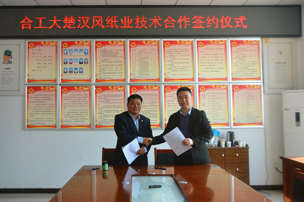 材料学院项宏发教授和楚汉风纸业有限公司法人张彬代表校企双方签署技术开发合作协议。